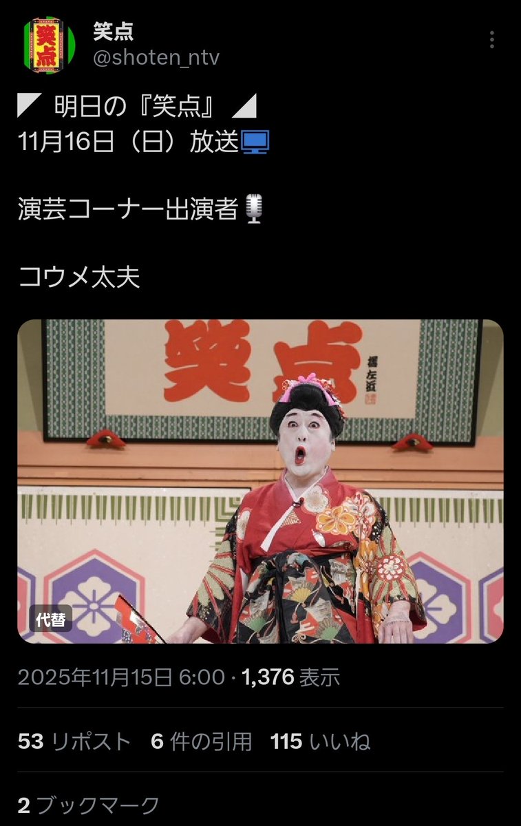 @shoten_ntv◤ 明日の『笑点』 ◢ 11月16日(日)放送📺 演芸コーナー出演者🎙️ コウメ太夫 pic.x.com/5BR6P0GAk2
