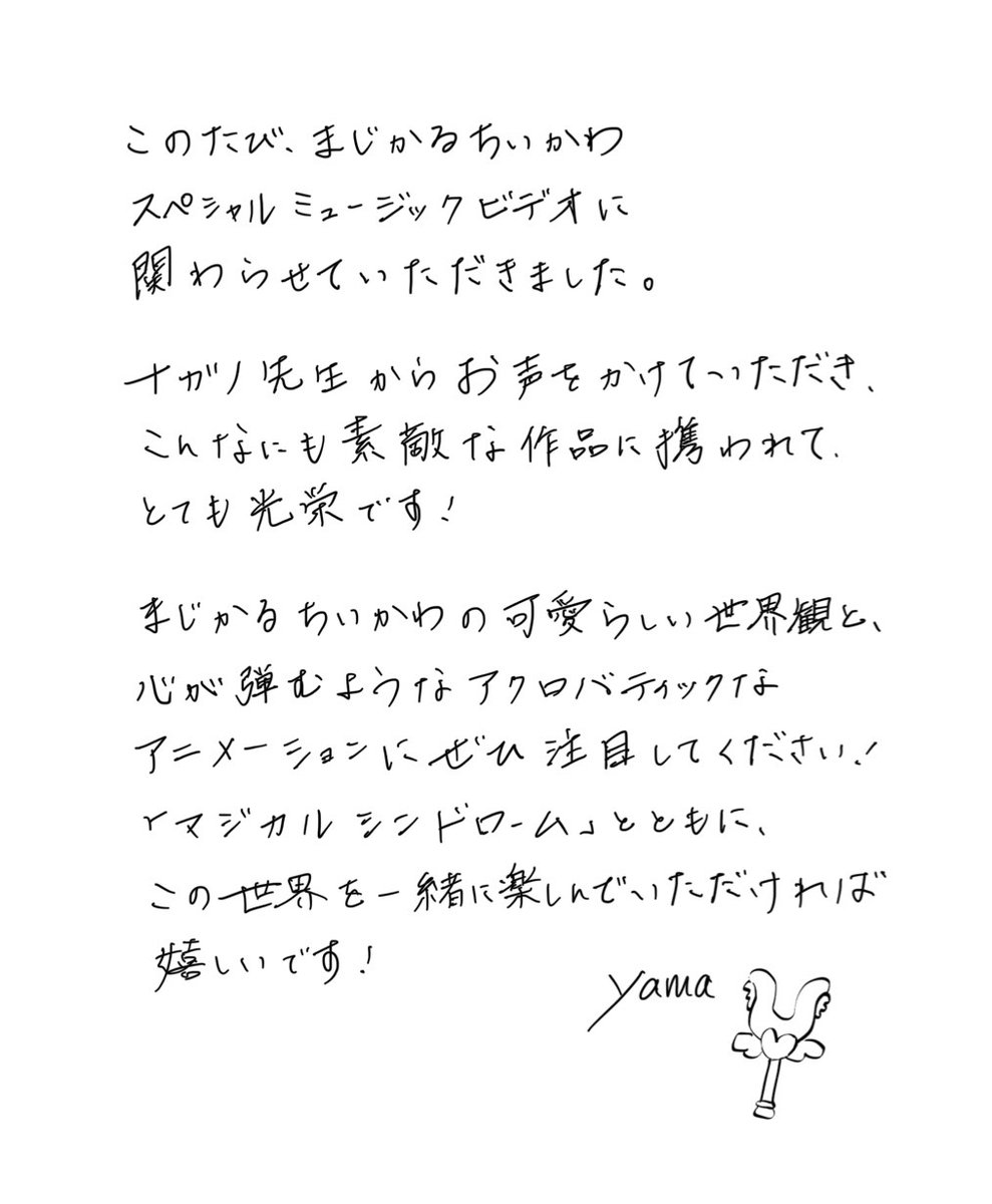 @chiikawa_kouhou🎀まじかるちいかわ×yama🎀 『#まじかるちいかわ』 スペシャルミュージックビデオ「マジカルシンドローム」 公開を記念してナガノ先生からお祝いメッセージを頂きました✨ ️ ▽MV公開中🎥✨ youtu.be/NvDkY-yabC4 #ちいかわ pic.x.com/9uA4KGUDHZ
