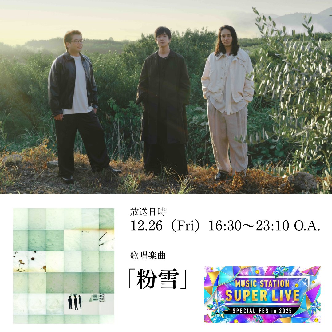 @remioromen_oa12月26日出演 テレビ朝日系「ミュージックステーション SUPER LIVE 2025」歌唱曲が発表されました。 レミオロメンは、「粉雪」を演奏いたします。 tv-asahi.co.jp/music/ #レミオロメン #Mステ @Mst_com pic.x.com/cskofHCXm0